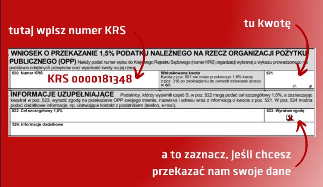 Wystarczy, że w zeznaniu podatkowym wpiszesz numer KRS wybranej organizacji pożytku publicznego (OPP) oraz kwotę, jaką chcesz jej przekazać. Kwota ta nie może być większa niż 1,5% Twojego podatku należnego. Więcej o tym jak przekazać swój 1,5% podatku w usłudze Twój e-PIT i nie tylko, znajdziesz na stronie podatki.gov.pl a wykaz OPP na stronie Narodowego Instytutu Wolności.