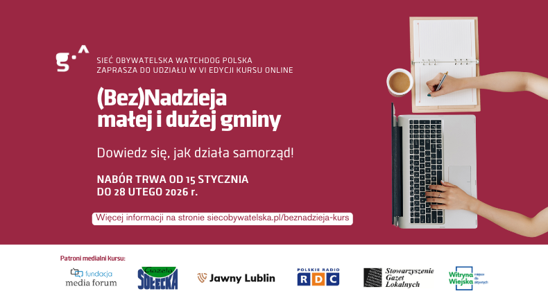 (Bez)Nadzieja małej i dużej gminy to cykl szkoleniowy organizowany przez Sieć Obywatelską Watchdog Polska. Składa się z wykładów prowadzonych online, a także treści udostępnionych na naszej zamkniętej platformie kursowej. Uczestnicy i uczestniczki kursu będą mieli również możliwość wymiany doświadczeń w grupie dyskusyjnej, a także konsultacji z naszym zespołem prawnym.