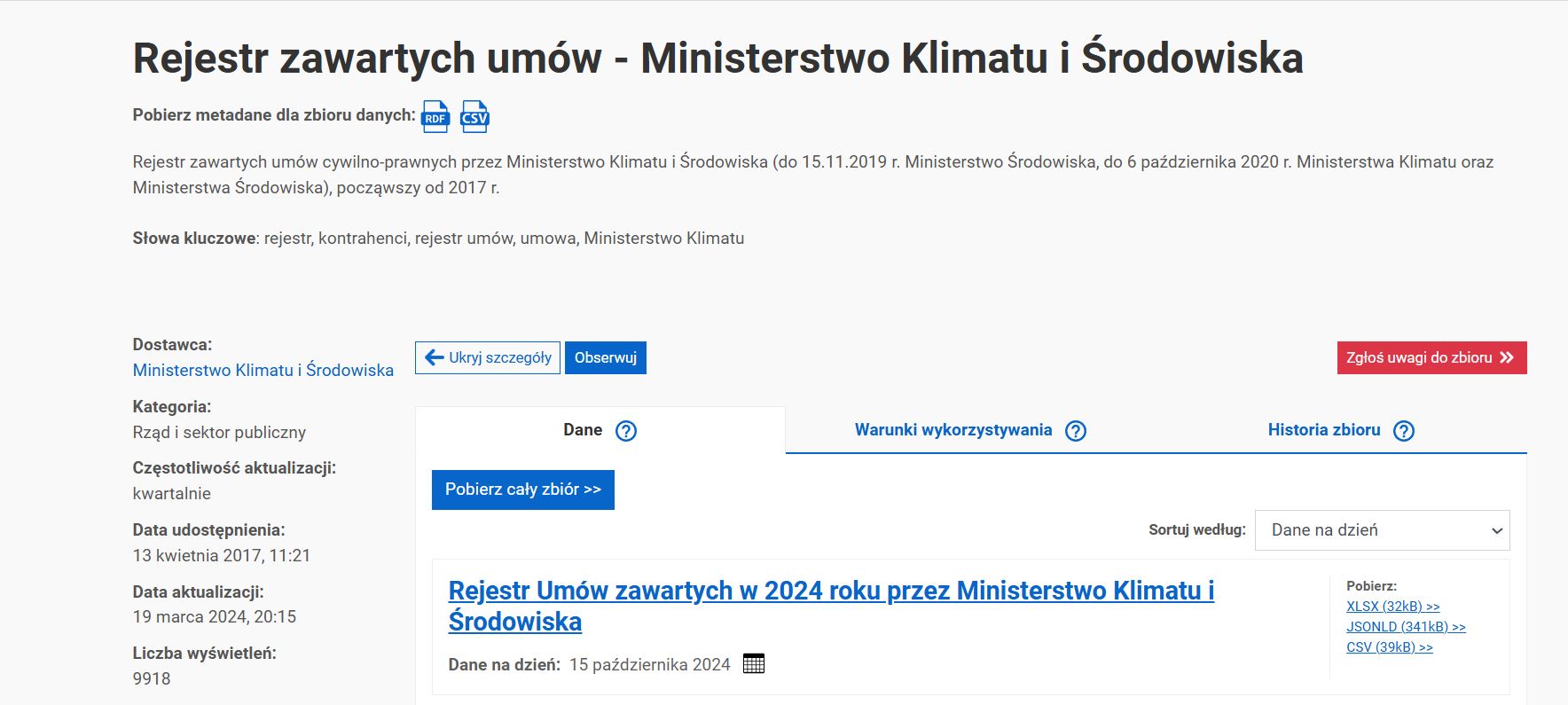 Ministerstwo Klimatu i Środowiska co prawda nie publikuje rejestru w BIP-ie, ale odesłało nas do portalu dane.gov.pl, gdzie zamieszcza dane o umowach. Sięgają one 2017 r., można je obejrzeć i przeszukać na stronie lub pobrać w aż trzech formatach. Dane z 2024 były aktualizowane, na dzień publikacji tekstu, ostatni raz 15 października.