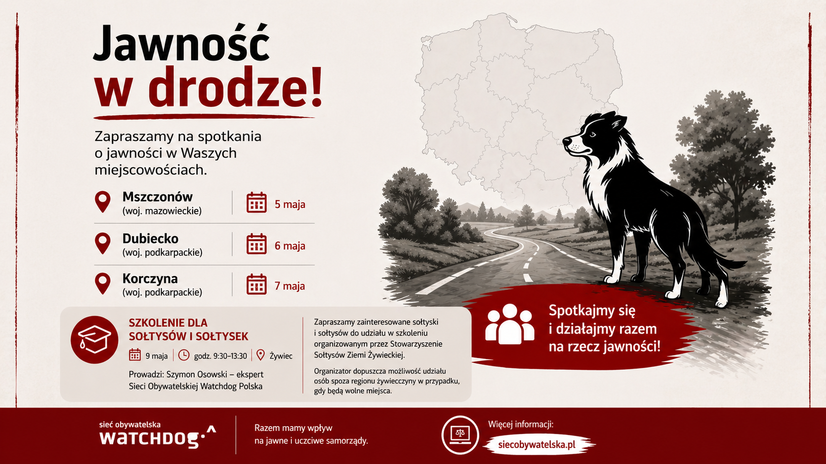 Sieć Obywatelska Watchdog Polska zaprasza na majowe spotkania “Jawności w drodze” w Mszczonowie, Dubiecku i Korczynie.