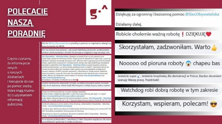 Twoja darowizna na modernizację Poradni Watchdoga to realne wsparcie, które pozwoli nam pomagać tysiącom osób rocznie. Tylko w tym roku udzieliliśmy pomocy ponad 800 osobom w około 1250 sprawach. Ich historie regularnie opisujemy na stronie informacjapubliczna.org oraz siecobywatelska.pl po to, by stały się inspiracją i wskazówką dla innych, którzy znajdą się w podobnej sytuacji.